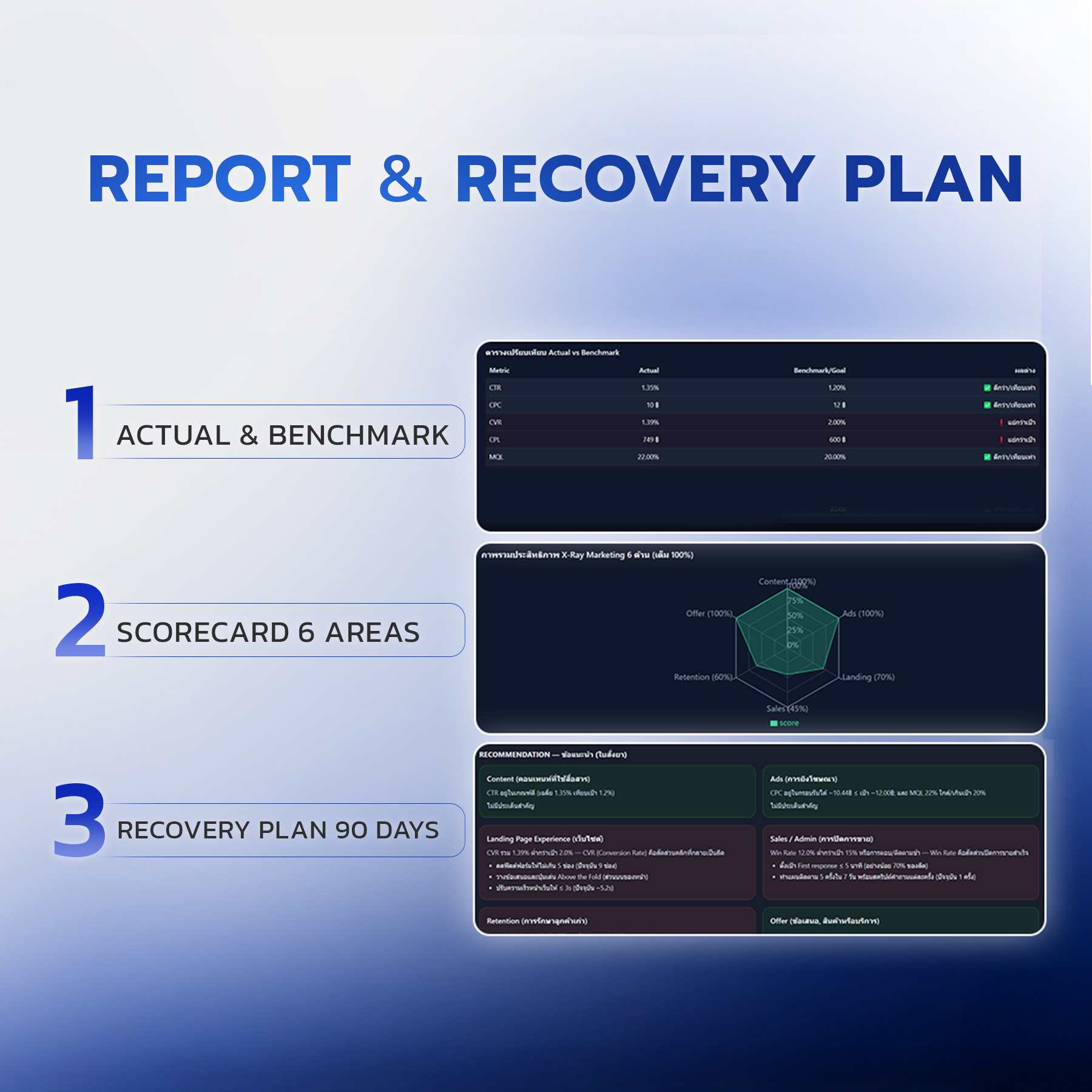 คุณจะได้ Top 3 Revenue Leaks พร้อม Roadmap 90 วัน ทำปรับใช้งานได้จริง ไม่ขายฝัน